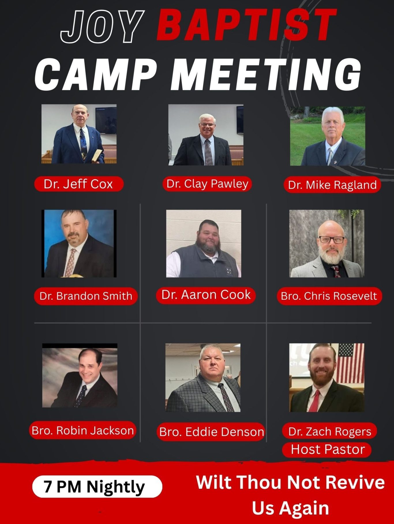 Dr. Zach Rogers (Pastor) started Joy Baptist Campmeeting in 2020 under the leading of the Holy Spirit. This will be our 6th annual meeting.
